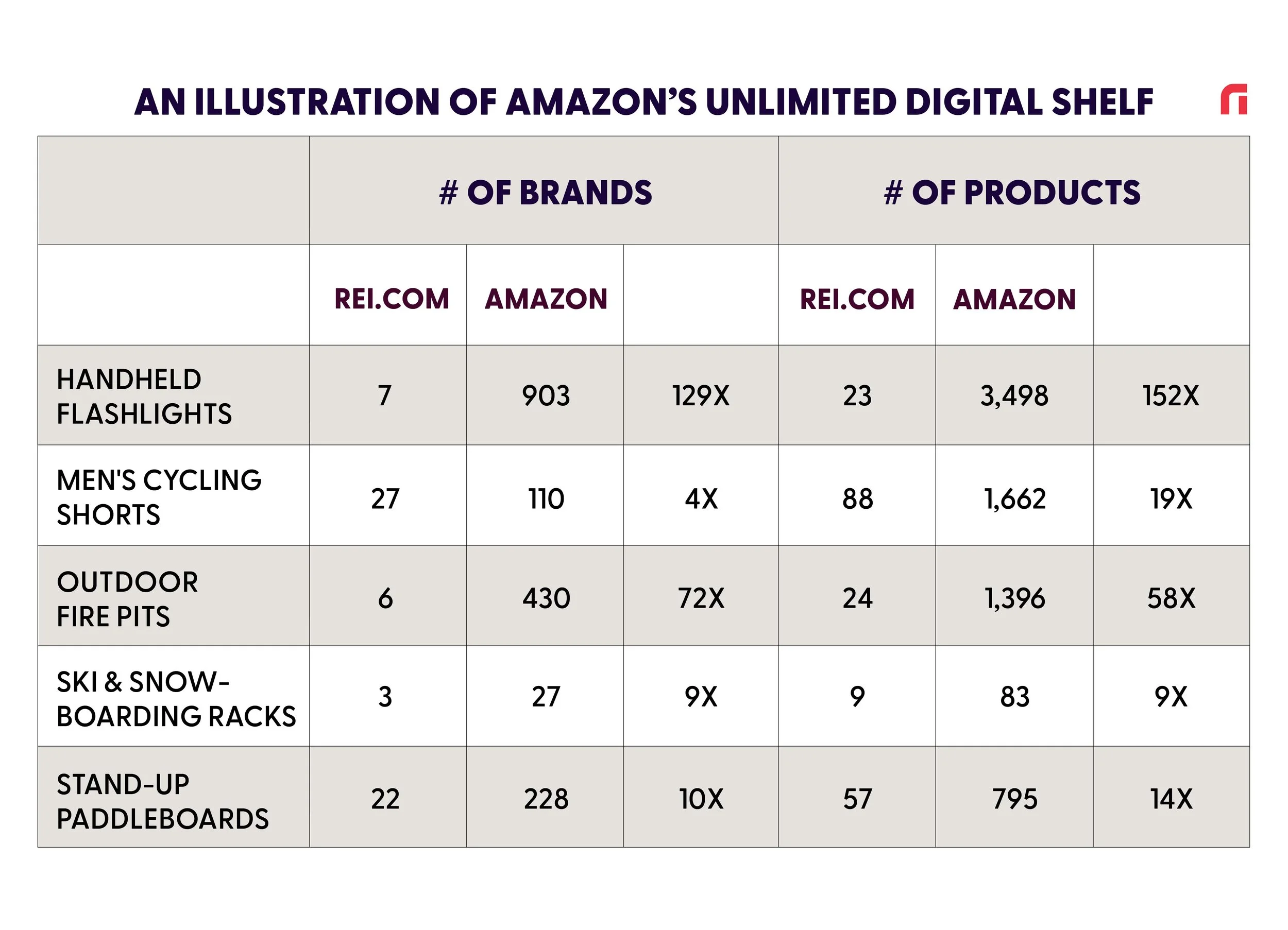 We set out to better understand this nuance by comparing the number of Sports & Outdoor brands and products on Amazon to REI.com. As shown in our sample below, brands can find themselves competing against anywhere from ~4x the amount of brands or products they are used to, all the way up to 100x or more in categories like handheld flashlights, where barriers to entry are extremely low.